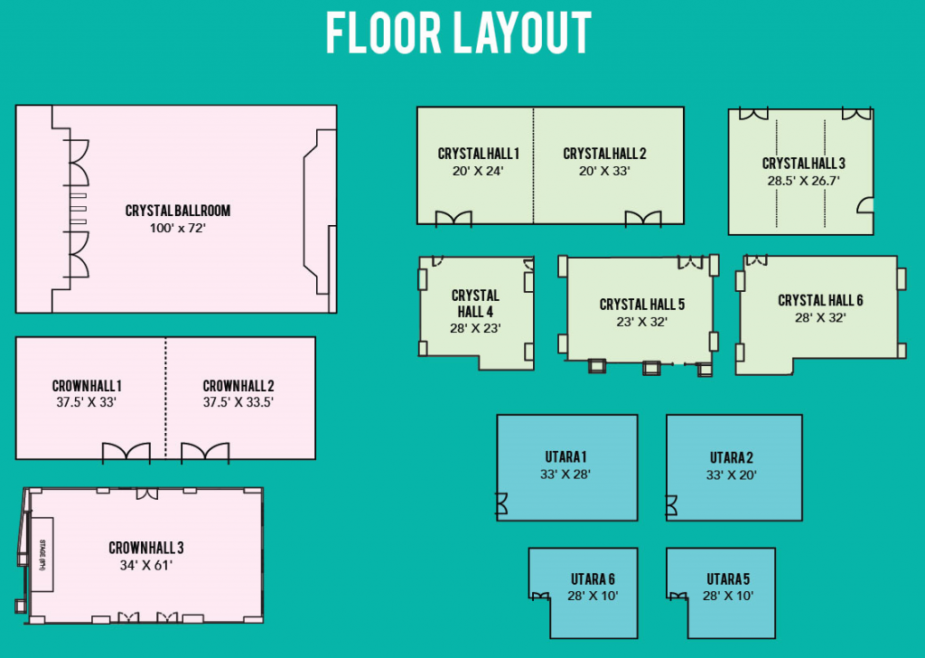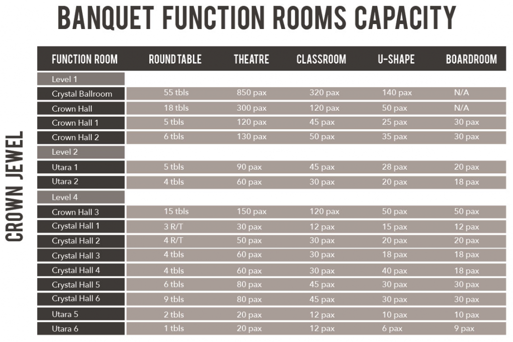 *The maximum seating arrangement on the above includes portable stage set-up for Crystal Ballroom and Crown Hall and the main table set-up for Utara 1 and Utara 2.